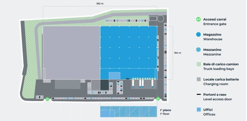 Inoltre è dotato di 10 baie di carico monofronte e di un portone a raso.