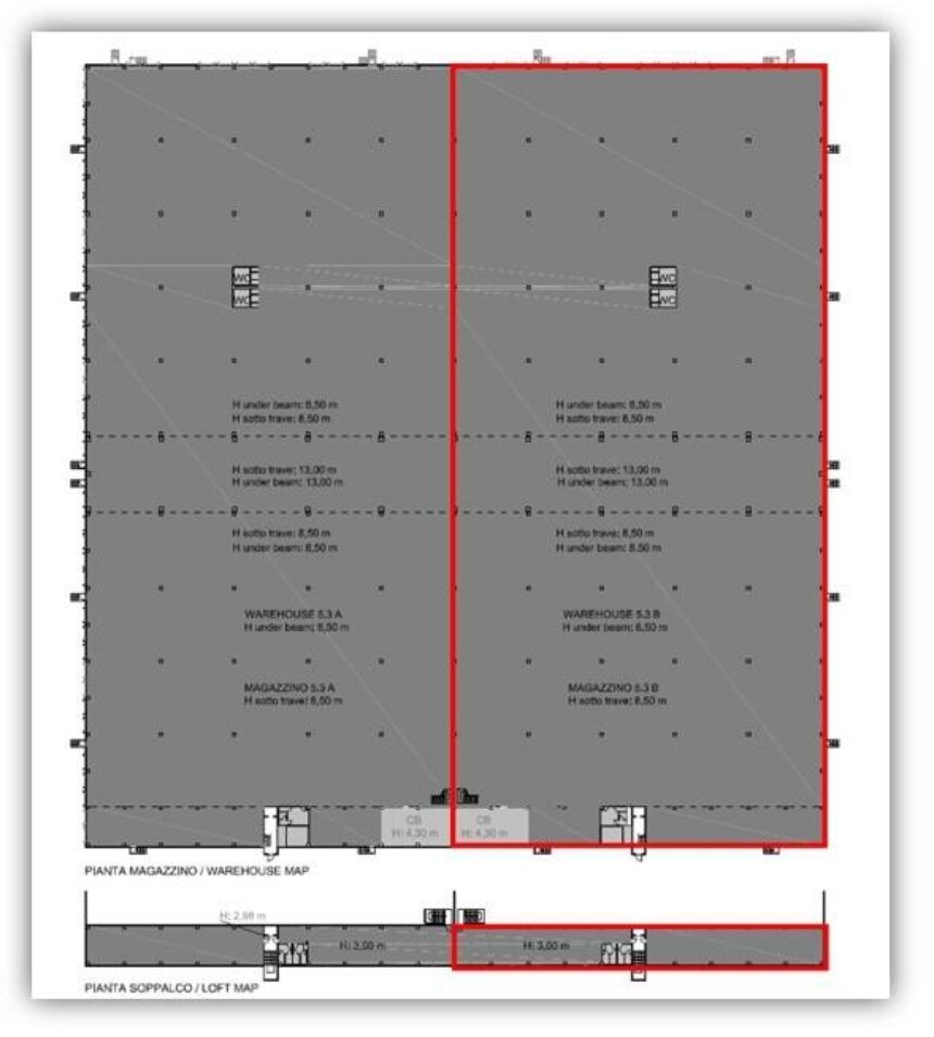La superficie disponibile è di 11.297 mq (di cui 295 mq ad uso ufficio) con altezza sotto trave di 9 mt.