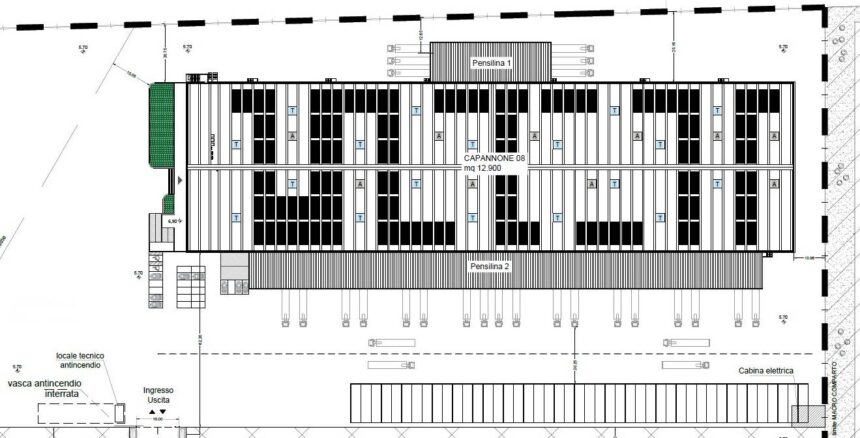 - deposito da 6.430 mq, con altezza utile di 11,50 mt e 24 baie di carico