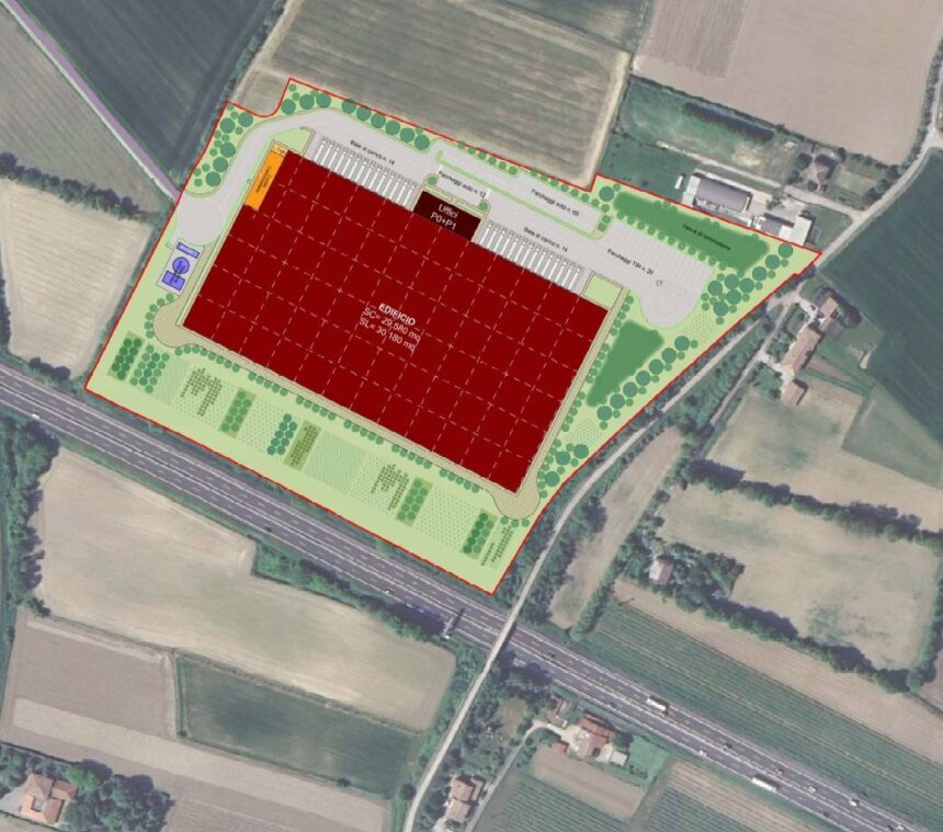 Su un lotto di circa 76.000 mq verrà costruito un immobile logistico da circa 30.000 mq di Superficie Coperta (SC).