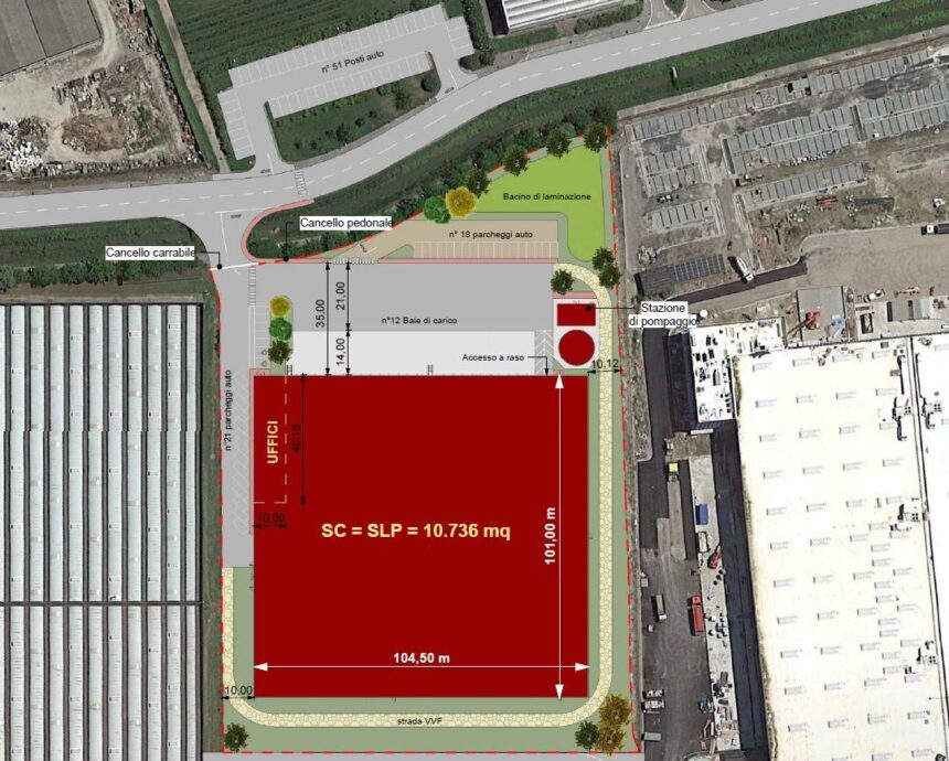 L'edificio, di nuova costruzione, avrà una superficie totale (SLP) di 10.736 mq, di cui 400 mq ad uso ufficio e 438 mq di servizi (caricabatterie, serbatoio acqua, locale pompe).