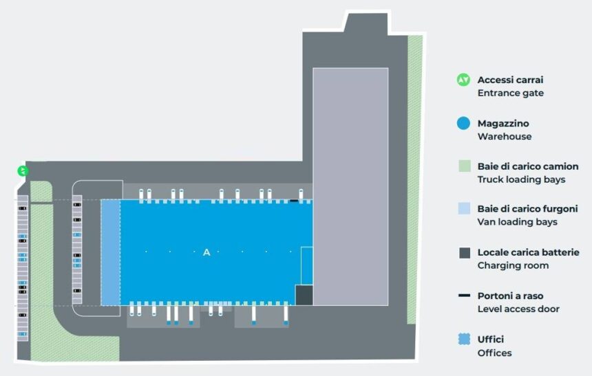 Il magazzino cross-dock è dotato di 31 baie di carico per furgoni, 12 baie per camion e 1 portone a raso.